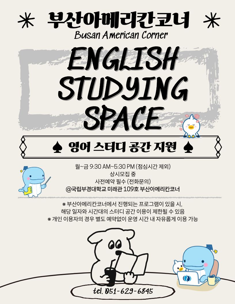 □ 스터디 공간 지원 개요 ○ 대상: 우리 대학 및 타 대학 재학생 - 영어 학습을 위한 팀, 동아리 또는 스터디 그룹(최소 2명 이상) ※ 개인 이용자의 경우 별도 예약 없이 운영 시간 내 자유롭게 이용 가능 ※ 대여 기간(시간)은 학내 사정에 따라 변경될 수 있음 ○ 장소: 미래관 109호 부산아메리칸코너 □ 스터디 공간 예약 및 이용 ○ 이용 가능 시간: 월~금(평일) 9:30 ~ 17:30 (공휴일 및 점심시간 제외: 12:00 ~ 13:00) - 1시간 단위로 예약 가능하며, 일일 최대 3시간까지 이용 가능 ※ 부산아메리칸 코너에서 행사 진행, 특화 프로그램 운영 시에는 이용 불가 ○ 예약 방법: 사전예약 필수 / 유선을 통한 예약 (☏ 051-629-6845) - 이용일 기준 최소 2일 전까지 전화 문의 요망 ○ 이용 시 유의사항 - 영어 스터디 활동 외 타 목적으로 사용 불가 - 코너 내 음식물은 반입할 수 없으며, 이용 후 정리 정돈 필수 - 예약 후 변경(취소)가 필요한 경우 최소 1일 전까지 유선으로 연락 요망